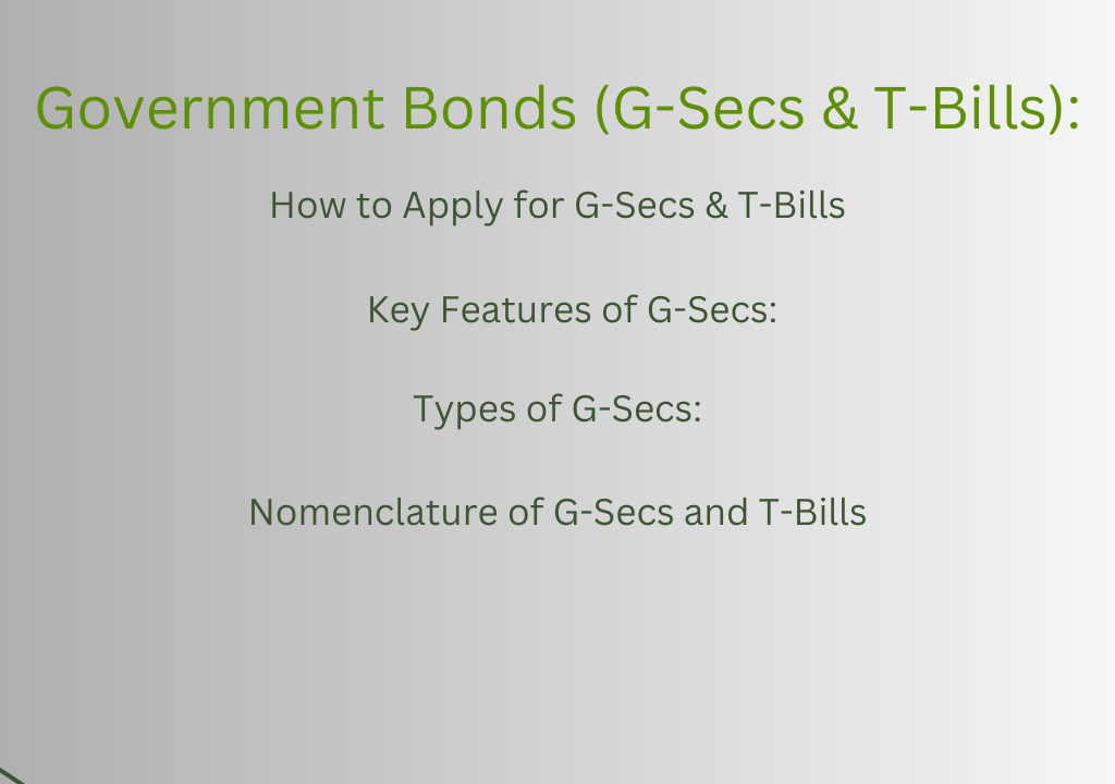 - Government Bonds (G-Secs & T-Bills): Issued by the central and state governments, these are considered low-risk investments.Government Securities (G-Secs)Government Securities (G-Secs) are long-term debt instruments issued by the Government of India or state governments. They are used to finance fiscal deficits and public sector projects.Key Features of G-Secs: